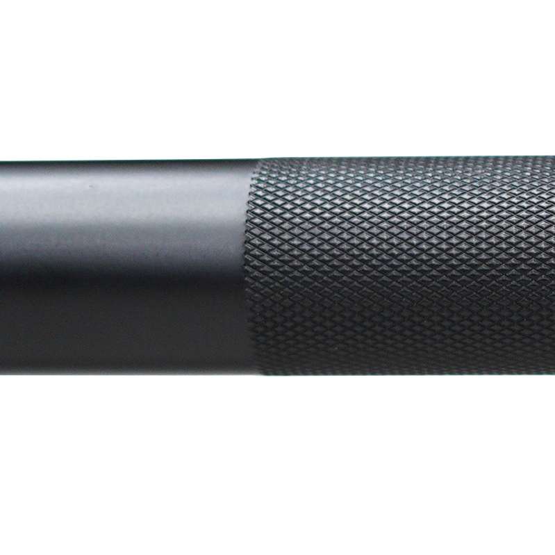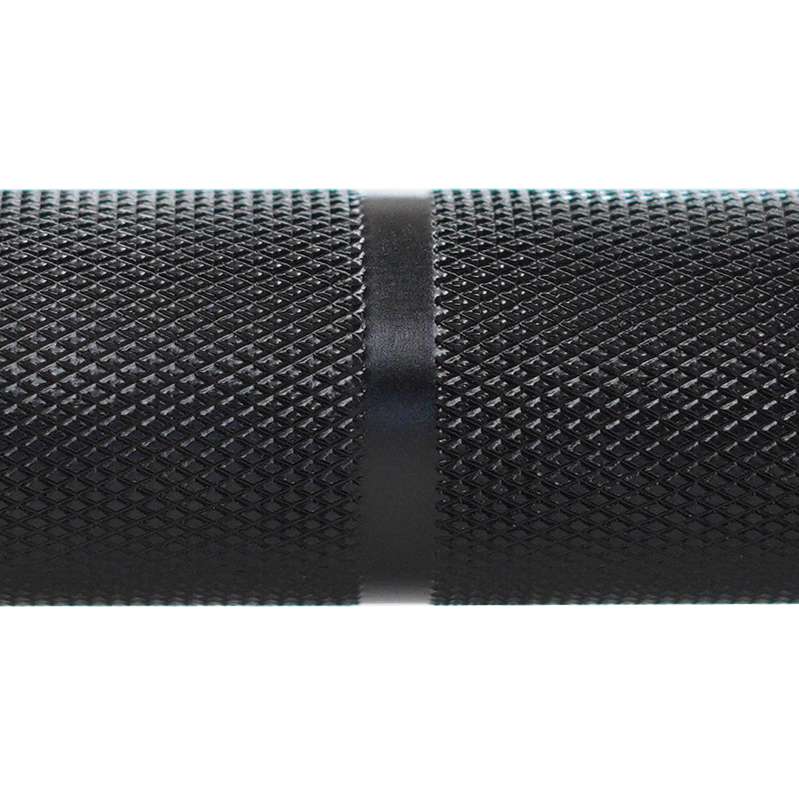 This barbell has medium knurling, also known as volcano knurling and a centre soft knurling, also known as hill knurling. And single grip markers for Olympic weightlifting.